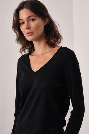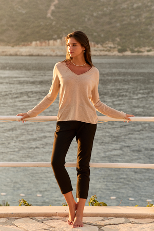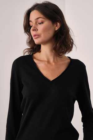 Super-lightweight v neck sweater with rolled neck, sleeves, and hem, made from our summer cotton/blend yarn.
