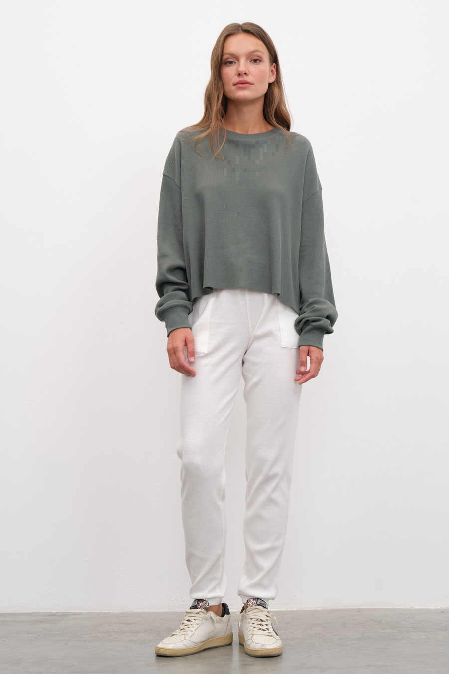 Oversized, crop sweatshirt, perfect for layering or wearing solo, made from our custom-made waffle cotton fabric.