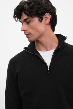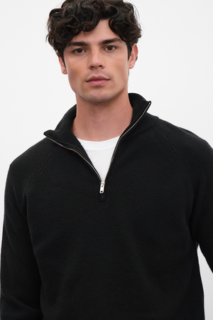 Relaxed-fit, half-zipped unisex sweater with raglan sleeves, made from ecologically sustainable, hypoallergenic, extra-fine Italian merino wool.